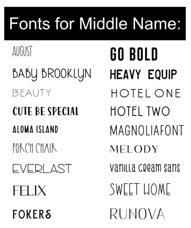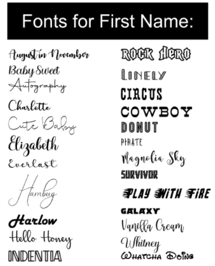 In the comments section at checkout, enter your names, font choices, and name colors. Be sure to double-check spelling as names will be copied and pasted from what you have typed.